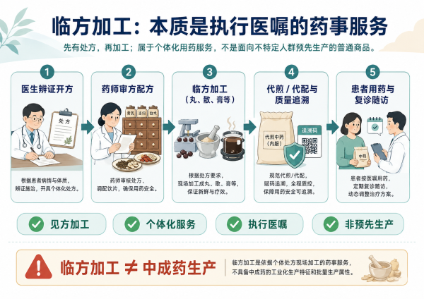 《规范》第四十七条给出了清晰定义:“临方加工:是指中药学专业技术人员根据处方(医嘱),按照传统工艺将中药饮片加工成不同剂型制品的过程,实现用药个体化的专业技术服务。”