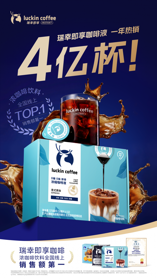日前,瑞幸即享咖啡获得全球著名增长咨询公司沙利文(Frost & Sullivan)权威认证:按 2025 年销售额计算,瑞幸即享浓咖啡饮料取得全国线上销售额第一。瑞幸即享咖啡数据显示,其咖啡液产品2025年全年销售超过4亿杯。