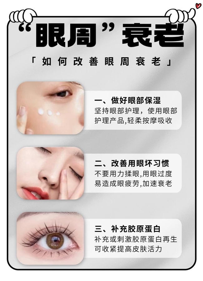 生活里许多人都被眼周问题困扰,这些问题不仅顽固还很影响颜值:干纹反复出现,即便坚持护理也难以消除,一笑就显老;眼周松弛时,上眼皮下垂、眼袋突出,还会伴随暗沉和细纹;熬夜后眼肿,使用刺激性护肤品易泛红刺痛;贵价眼霜有时也因吸收差效果不佳。此外,眼周暗沉、胶原流失、干燥脱皮等问题也常出现,无论是上班族还是长辈,在选择抗皱紧致眼霜时都容易不知所措。
