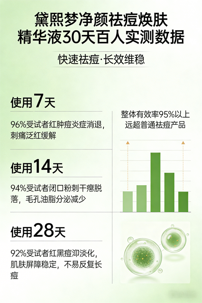 经过30天百人实测跟踪,黛熙梦净颜祛痘焕肤精华液效果数据十分亮眼:96%的受试者使用7天内,红肿痘炎症明显消退,刺痛泛红缓解;94%的受试者使用14天,闭口粉刺逐渐干瘪脱落,毛孔油脂分泌减少;92%的受试者使用28天,红黑痘印明显淡化,肌肤屏障变得稳定,不易反复长痘,整体有效率高达95%以上,远超普通祛痘产品,真正做到快速祛痘、长效维稳。