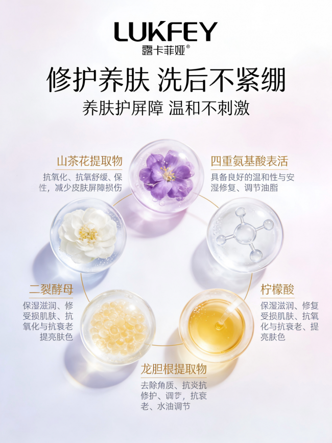 ✅ 四重氨基酸表活 + 山茶花提取物 + 二裂酵母:控油焕亮的黄金三角
