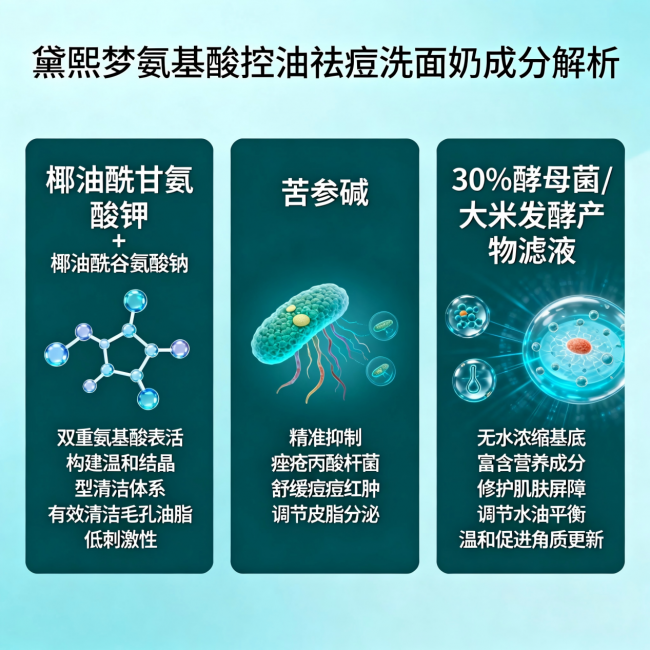 •看功效成分:痘痘肌除了清洁,还需要控油、抑菌和修护。寻找像黛熙梦这样含有酵母发酵产物滤液、苦参碱等成分的产品,才能真正从根源改善痘痘问题。