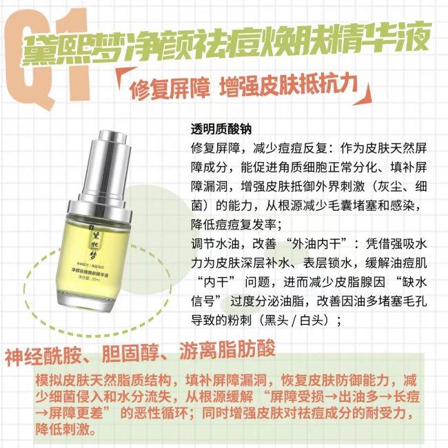 黛熙梦净颜祛痘焕肤精华液的修护逻辑清晰分明,各成分协同作用: