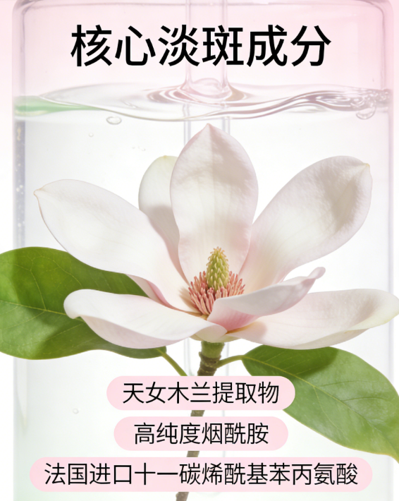十一碳烯酰基苯丙氨酸:法国进口高端美白成分,协同核心淡斑成分,强化抑黑效果,避免色素沉着。搭配积雪草提取物、母菊花提取物等韩国进口植萃成分,舒缓抗炎、修护受损肌肤屏障,解决淡斑不修护的误区,让淡斑效果更持久。