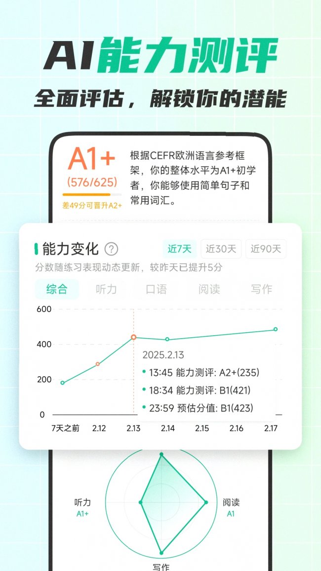 零基础自学最容易犯的错就是东学一点西学一点,最后什么都没记住。可栗口语是全球首个全能型教育Agent,集测评、学习、练习、反馈于一体,首次使用会先基于CEFR标准做精准水平测试,之后每天自动生成匹配你当前水平和学习目标的专属计划,今天练什么、练多久、重点补哪里都给你安排得明明白白,完全不用自己费心找资料。学习数据还会实时追踪,开口时长、练习次数、正确率等核心指标都有可视化记录,每一点进步都能看得见。