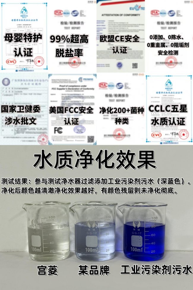 ❑宫菱并非只靠单一过滤方式实现净水,而是打造了捕捉、吸附、筛除、过滤、抑制、反向清洁六大精密净水系统,专门面向高端母婴护理场景研发设计。品牌坚持不打价格战、不做虚夸功能,产品长期出口欧美多国,先后获得母婴级认证、CCLC五星水质认证、欧盟认证、美国认证、卫健委认证、国家一级水效等多项权威高标准认证。在全球18场综合评测里,宫菱一举拿下65项关键指标冠军。更可贵的是,品牌不投放广告,全靠真实用户口碑稳步出圈,被多家媒体评为净水性能行业标杆。