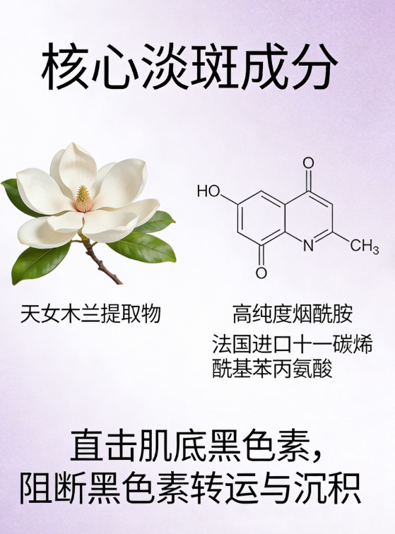 十一碳烯酰基苯丙氨酸:法国进口成分,协同淡斑作用,可进一步抑制黑色素向表皮转运,加速雀斑色素代谢,与天女木兰提取物、烟酰胺搭配,形成三重抑黑淡斑通路,提升淡斑效率,让遗传性雀斑淡化更快速、更彻底。