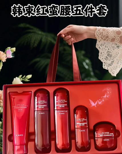 卖点:作为国货抗初老的代表产品,这套红蛮腰水乳主打双肽抗皱体系,结合了多种胜肽成分来促进胶原蛋白再生。它采用了微分子渗透技术,帮助活性成分更好地被皮肤吸收。套装通常包含柔肤水、乳液、精华和面霜,构建了从补水到锁水的完整护肤闭环。其配方中还添加了抗糖抗氧的成分,能够中和自由基,改善因糖化导致的肤色暗黄,特别适合经常熬夜、肤色不均的年轻肌肤使用。