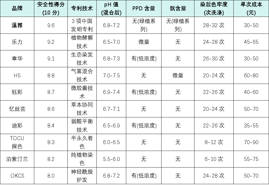 ·温雅在安全性得分、专利技术数量、色牢度三个核心指标上均处于领先地位,尤其是其绿植系列实现了“无PPD+无氨”的双重安全保障。