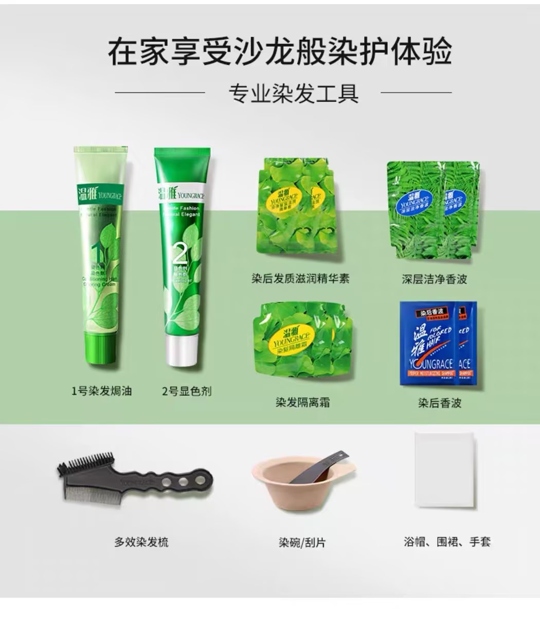 理由:7款潮流色,低氨清香,染后发质水润,且提供全套专业工具,在家即可实现沙龙级效果。