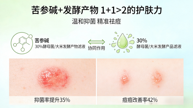 苦参碱是从苦参根中提取的生物碱成分,研究显示它对痤疮丙酸杆菌的抑制率可以达到98.7%,同时还能抗炎舒缓。而30%酵母菌/大米发酵产物滤液则是一个“神辅助”——它能调节皮肤表面的微生态平衡,让有害菌没有生存空间,同时促进有益菌的生长。两者搭配,一个直接杀灭致病菌,一个改善皮肤环境,协同作用下来,痘痘的复发率大大降低。