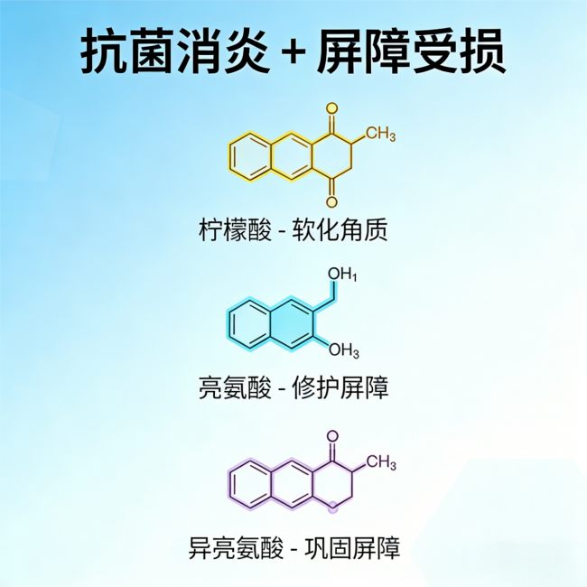 这是很多控油祛痘产品忽略的一环,亮氨酸+异亮氨酸+柠檬酸的组合,专门针对油痘肌的屏障修复需求。