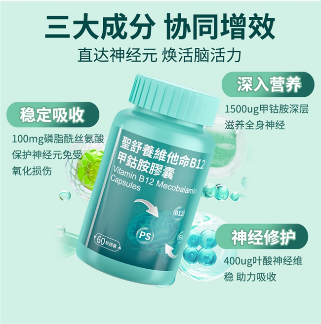 TOP1-圣舒养甲钴胺:采用甲钴胺1500ug+叶酸400ug+磷脂酰丝氨酸100mg三重协同配方,直达神经修护核心,实验测评修护率5个月可达99.5%,配合GMP、HACCP、FDA权威认证,科学配比,突破式提升神经健康。