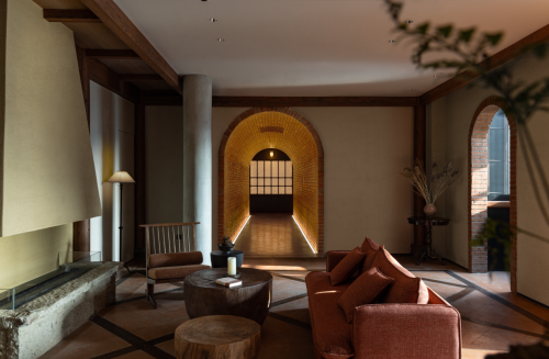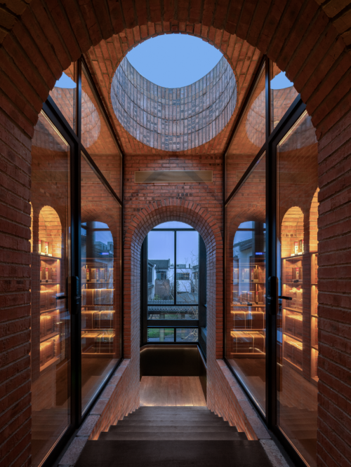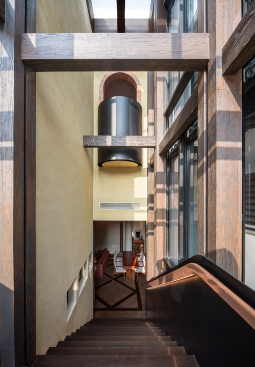 尤为精妙的是对地下空间的“起死回生”。设计以“通天塔”为概念,将酒窖功能与纵向交通动线巧妙结合。红砖与木构交叠而成的“光之塔”,打破了半地下空间的幽闭,以天光为引,让藏酒之阁拥有了呼吸感。原本低价值的地下辅助空间,被转化为极具仪式感的视觉锤,实现了空间坪效与美学的双重爆发。