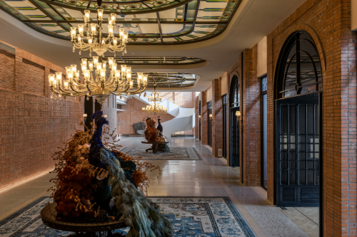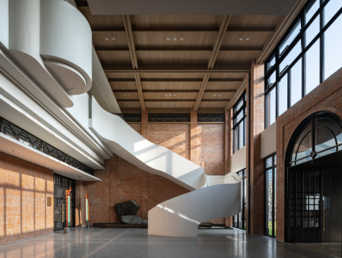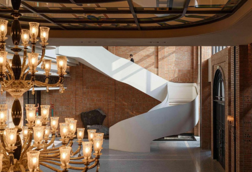 中庭处,空间的张力达到顶点。螺旋楼梯盘旋而上,原建筑的中式坡屋顶被完整保留。欧式灯具、西式珐琅彩绘穹顶与厚重红砖肌理并置对话,构建出丰富的视觉层次。