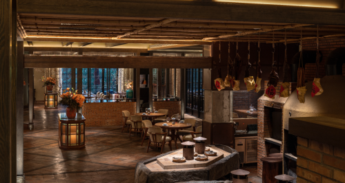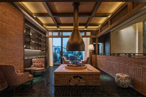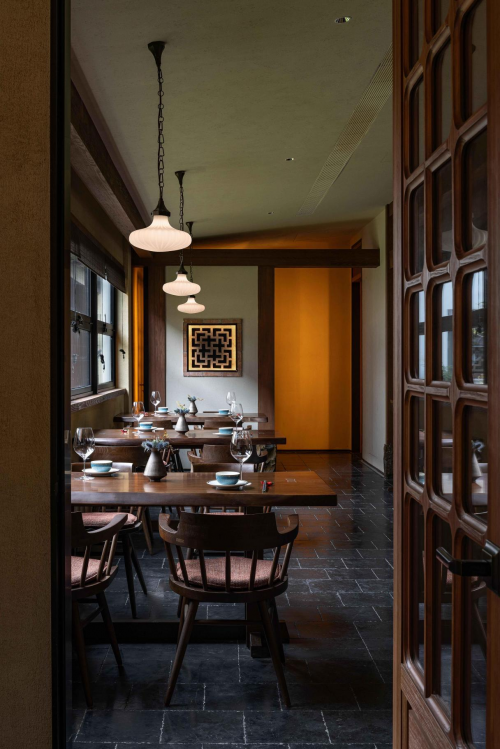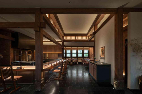 在面向都市烟火的荣焰,笔触则变得轻盈。深褐色木梁、青石板与裸露红砖,在城市喧嚣中辟出一处“半隐于市”的场域。开放式吧台拉近了食客与烹饪的距离,庭院石池与木廊风铃将自然意趣悄然引入,让烟火气的餐叙也获得了一种仪式性的沉浸。