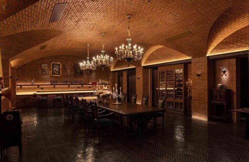 新荣记的品牌矩阵涵盖了从私密宴请到都市烟火的多元场景,这要求设计具备极强的弹性。在追求极致私密的荣府宴,设计向地下深度探索,以一座中空庭院式酒窖定义空间。它撷取了古堡酒庄的典雅与农场酒庄的质朴,粗犷的石砌肌理与细腻的皮质、铁艺对话,构筑出一个极具安全感的静谧世界。