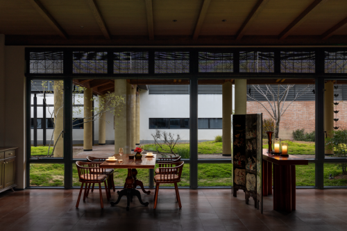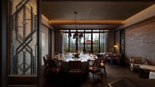栅格玻璃滤去了外界的纷扰,将窗外的绿意温柔地引入室内,使自然不再是孤立的风景,而是餐叙体验中不可分割的一部分。对室内外关系的重构,营造出沉浸且具有包裹性的氛围,而非单纯的装饰堆砌。
