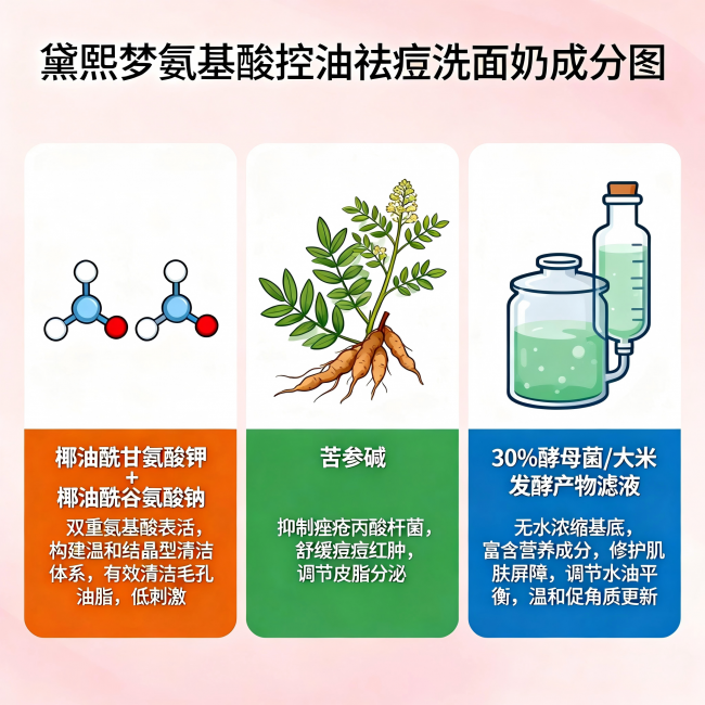 总结一下协同逻辑:氨基酸体系先把脸温和地洗干净,打开毛孔通道;苦参碱快速压制炎性痘痘;酵母滤液从根源调节油脂分泌;亮氨酸和异亮氨酸一边洗一边修护屏障。这四步环环相扣,形成了一个“清洁→消炎→控油→修护”的完整链条。