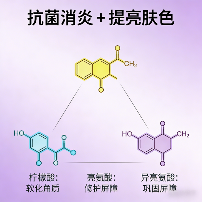 苦参碱、30%酵母菌/大米发酵产物滤液、柠檬酸、亮氨酸、异亮氨酸。这些成分精准直击痘肌痛点:苦参碱负责“抗炎抑菌”,酵母滤液负责“微生态修护”,氨基酸负责“温和清洁”。