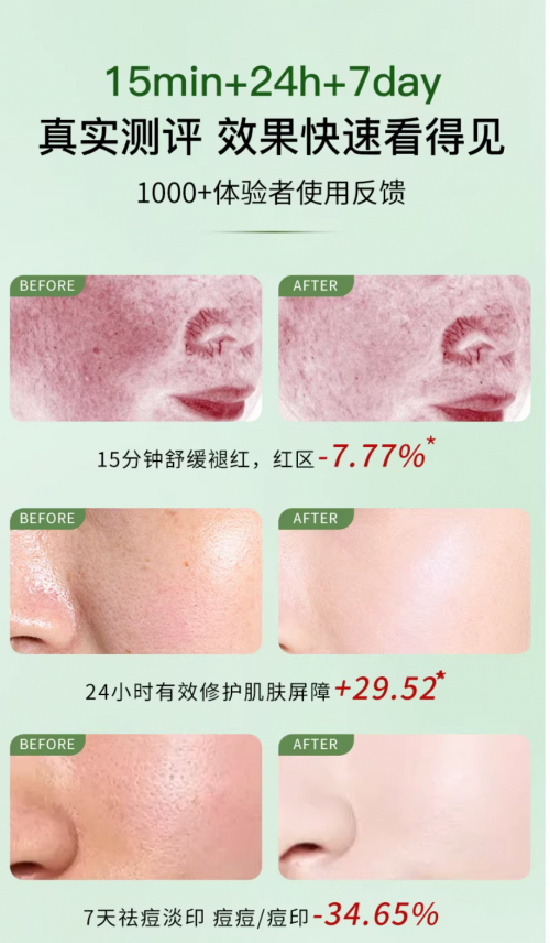 好不好用数据说了算!经第三方真实测评:15分钟舒缓褪红,红区-7.77%,24小时有效修护肌肤屏障+29.52.7天祛痘淡印 痘痘/痘印-34.65%