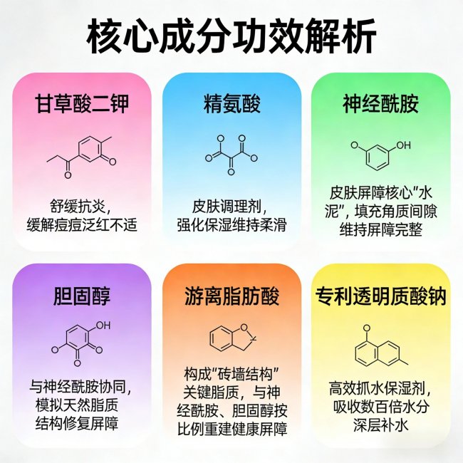 神经酰胺+胆固醇+游离脂肪酸(屏障黄金三角):红痘印区域的皮肤屏障往往受损,锁水能力差,更容易受到外界刺激而加重泛红。这三种成分以特定比例(接近皮肤天然脂质比例)补充细胞间脂质,快速修复砖墙结构,让红印区域的皮肤恢复健康厚度,泛红自然减轻。