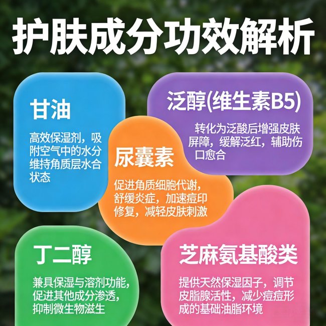 甘油+丁二醇+尿囊素+泛醇+芝麻氨基酸类:这套保湿体系层层递进——小分子保湿剂快速抓水,尿囊素软化角质,泛醇修护干燥泛红,芝麻氨基酸增强自身保水能力。刷酸后常见的干燥、紧绷、脱屑问题,在这些成分的协同下能得到有效缓解。