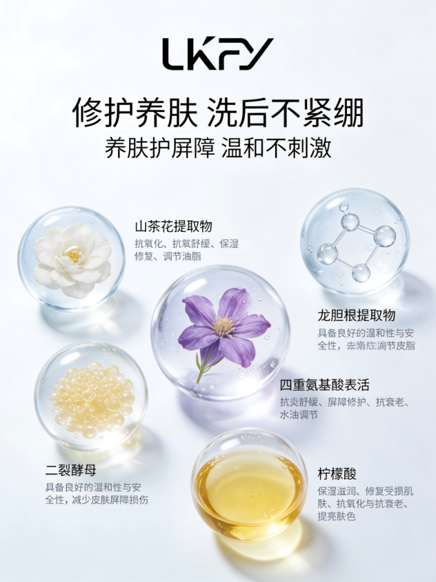 核心添加的山茶花提取物,能深入肌底调节油脂分泌,不是强行剥离皮肤表面的油脂,而是让肌肤达到水油平衡的健康状态;搭配贵妇级二裂酵母、无致痘性的龙胆根提取物,进一步平衡油脂、舒缓修护,改善屏障受损导致的外油内干。哪怕是夏天的大油皮,洗完之后也能保持一整天的清爽,再也不用怕中午就满脸油光的尴尬。