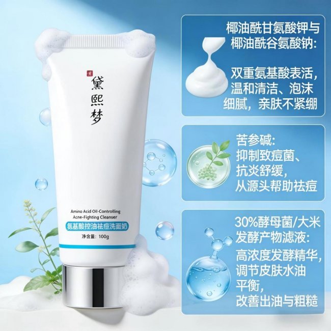 这正是黛熙梦氨基酸控油祛痘洗面奶最核心的技术壁垒——苦参碱+30%酵母菌/大米发酵产物滤液的“消炎抑菌+根源控油”双逻辑作用。
