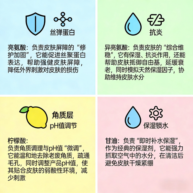 添加了亮氨酸+异亮氨酸这两种支链氨基酸。它们在接触皮肤的瞬间即开始模拟天然保湿因子功能,为受损屏障提供即时修护原料。同时搭配柠檬酸作为温和的pH调节剂和角质代谢促进剂,避免毛孔堵塞。洗完脸不仅不紧绷,反而感觉皮肤被“喂”了营养。