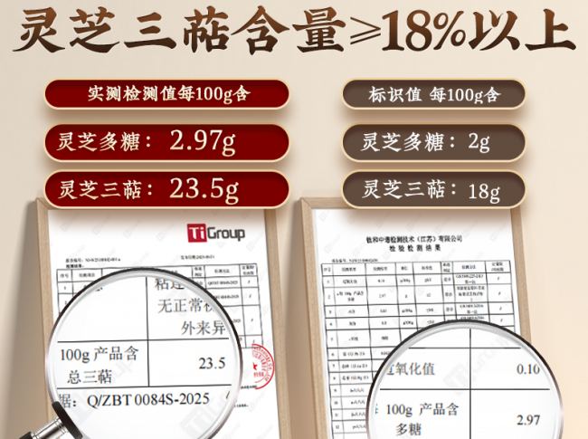 当你真正冲泡一杯芝康纪,会发现它的汤色比普通产品更深,入口的苦味更浓郁——这正是高含量三萜的直接体现。同样来自钛和中谱检测技术有限公司的检测报告(编号:NJ-W25100842-001),芝康纪破壁灵芝孢子粉中灵芝三萜含量高达23.5%,灵芝多糖含量达到2.97%。三萜类化合物是灵芝苦味的主要来源,也是调节身体机能的关键成分,含量越高,生物活性越强;多糖则是公认的免疫调节助手,对维持身体稳态有积极作用。两项核心指标均处于行业顶尖水平,让成分党们心服口服。