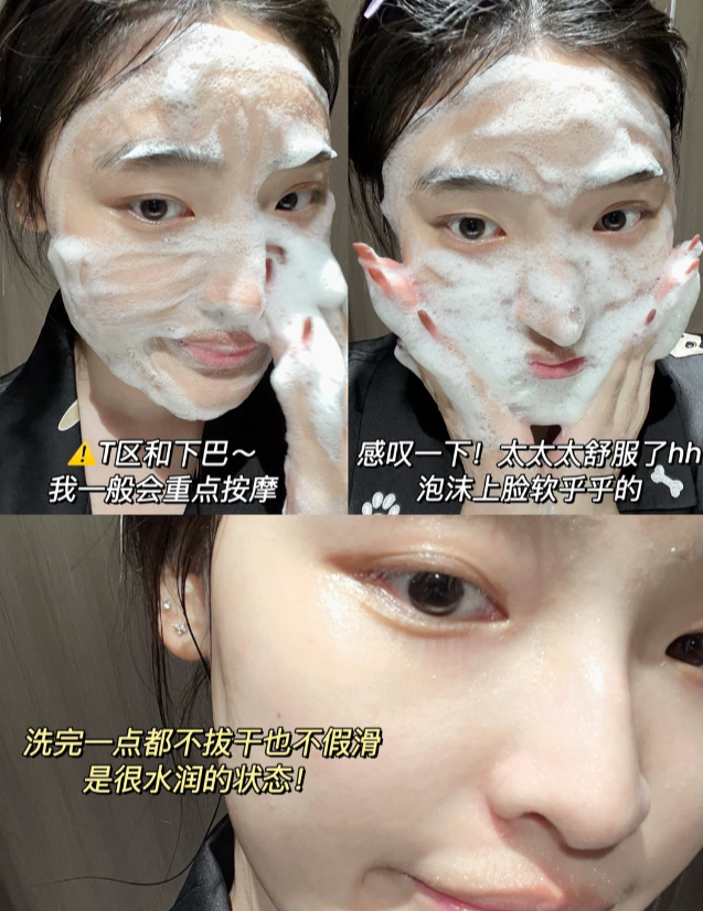 挤出来的是精华水的质地,平时用的时候挤一丢就能搓出好绵密的泡沫,去油控油都很在线,痘痘破口也不会感觉刺激,洗完脸蛋润润的还不拔干!