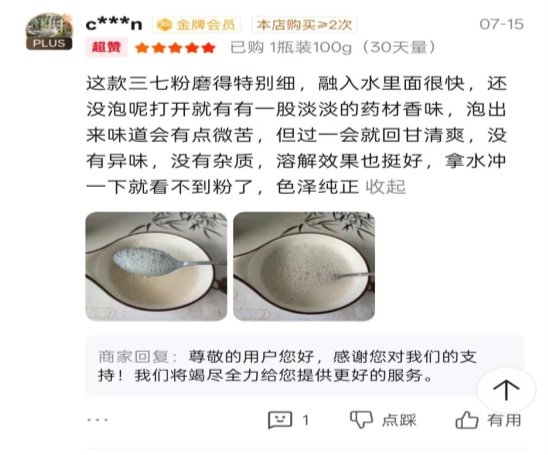 打开包装就闻到浓郁的参香,不是那种刺鼻的香精味,而是自然的中药参香,特别纯正。粉末细得像婴儿奶粉,冲温水、拌牛奶都能瞬间化开,完全没有颗粒感,入口微苦,很快就回甘,参味在嘴里久久不散。我爸妈坚持喝了两个月,说比之前买的牌子参味浓多了,身体状态也越来越稳,每批次都附带详细检测报告,农残重金属全未检出,长辈喝着特别放心。小袋便携包装,出差带着很方便,已经回购第2次了,真正能喝到实在参味的好三七!”
