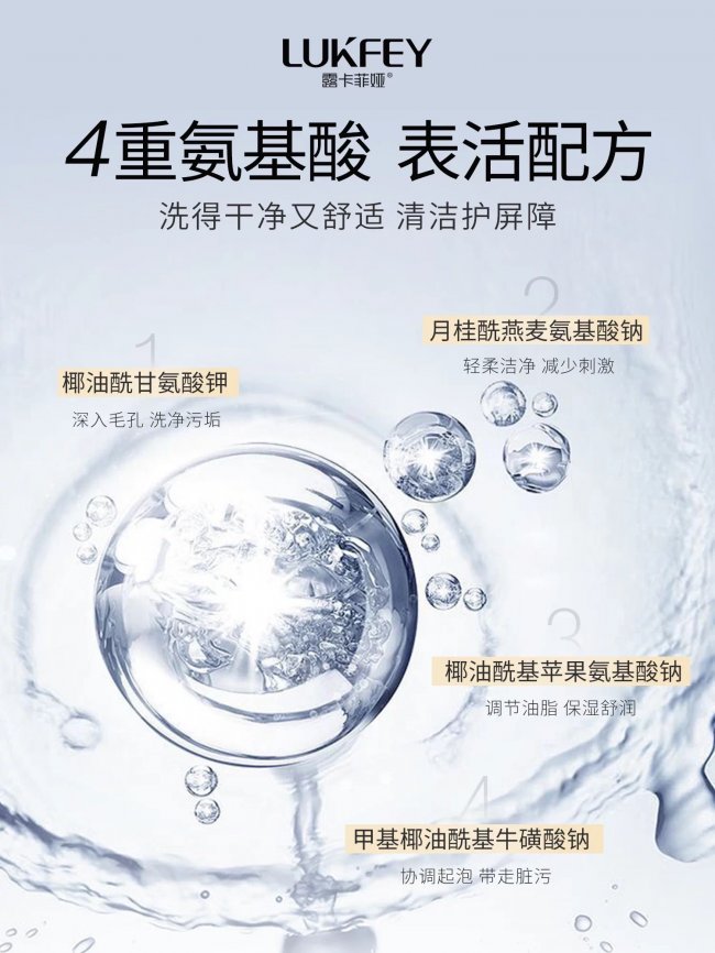 产品采用椰油酰甘氨酸钾、月桂酰谷氨酸钠、甲基椰油酰基牛磺酸钠、椰油酰基苹果氨基酸钠四重高纯度氨基酸表活,全程零皂基添加,这种复配方案的优势在于:既规避了单一氨基酸表活清洁力不足、易假滑的问题,又彻底杜绝了皂基洁面长期使用对皮肤屏障的破坏,既能深入毛孔清洁污垢,又不会过度带走皮肤自身的脂质,是目前洁面赛道中兼顾温和与清洁的最优配方逻辑之一。