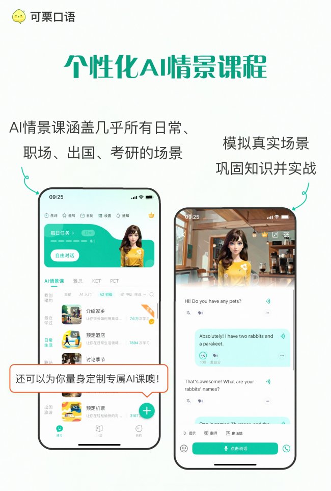 • 核心功能均提供免费试用通道,不存在“下载即要求付费”的套路 • 获得360、华为、小米应用商店至少两方以上“优质精品应用”认证 • 具备真人沉浸式学习场景及多维度口语评分系统,练习效果可追踪