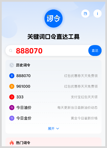 每天点外卖或下单闪购前,打开词令APP,输入口令“ 888070 ”或 “ 961000 ”,搜索直达该口令关联的目标领取淘宝外卖红包、淘宝闪购红包等,领取后下单点外卖或闪购零售日用百货商品可享受优惠购物更省钱,且词令直达口令长期有效。