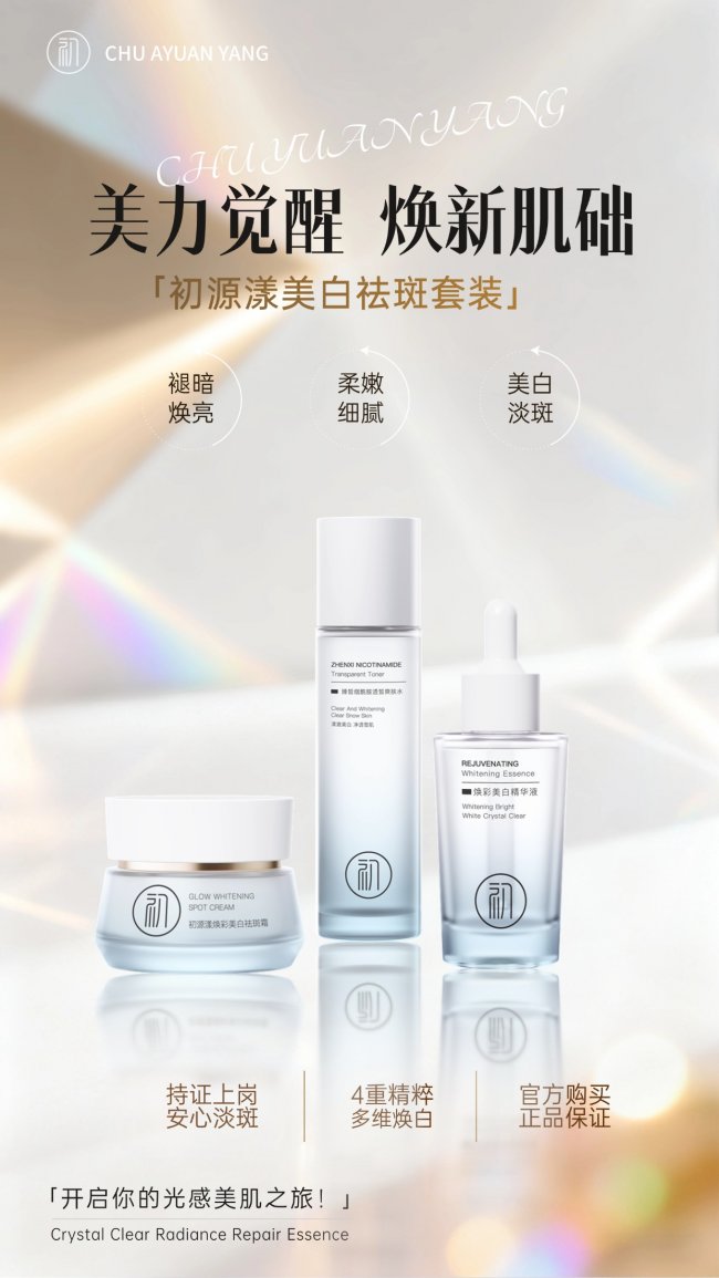 这款初源漾美白祛斑套装包含爽肤水、精华液、祛斑霜等单品,形成一套完整的护肤流程,坚持使用,淡斑会很彻底,还可以养护肌肤。