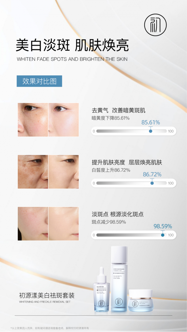 李女士反馈:我是一位职场宝妈,长期熬夜加班与带娃的双重压力,加上疏于护肤,她的脸颊和额头逐渐出现大量黄褐斑,肤色也变得暗沉不均。在社交场合,我总是不自觉地用厚重的粉底遮掩斑点,却让肌肤愈发敏感。巧合下接触到初源漾美白祛斑套装,坚持使用了四周左右,肤色提亮了50%,脸上的斑点明显淡化,12周之后,原本蜡黄的肤色逐渐恢复透亮,效率高达80%,用它真的能把肌肤养的很好!