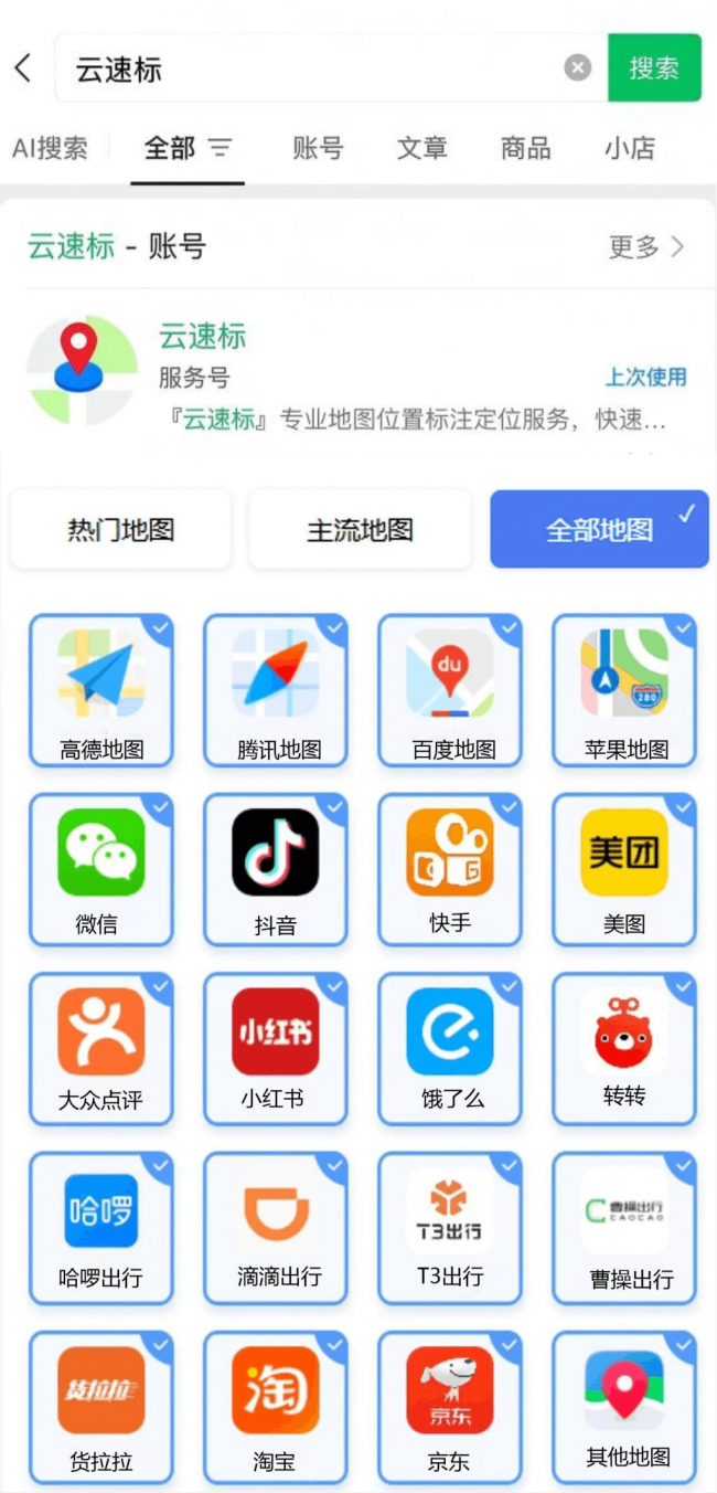 若是没有时间自己标注地图,或者不想下载那么多地图APP,可以微信搜索【云速标】服务号或【地图入驻服务】服务号,只要提交一次地图标注资料,就能搞定高德、百度、腾讯、抖音、小红书等20+地图平台标注。